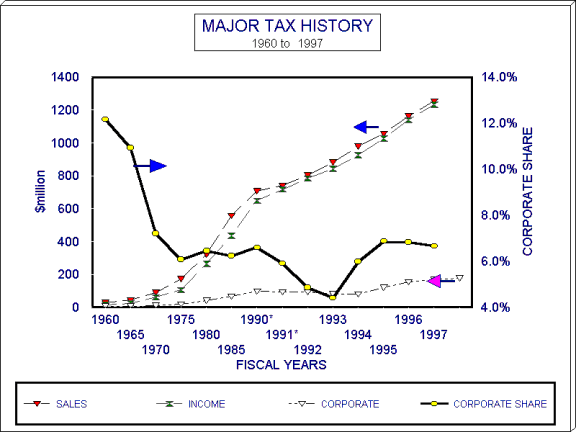 The line starting in the upper left and falling to the lower right shows corporate collections as a share of the three major taxes listed on the table. Although the share of corporate taxes fell for almost the entire period, the steepest five-year fall was from 1965 to 1970. Even though the rate was raised to 6 percent in 1965, the period of the Viet Nam related inflation from 1965 to 1975 was when the other taxes outpaced the corporate tax the most. The plot also makes obvious the declining relative share of corporate taxes in every five-year period, except from 1975 to 1980. In 1995 and 1996, the corporate share was slightly over the 1990 fraction.
